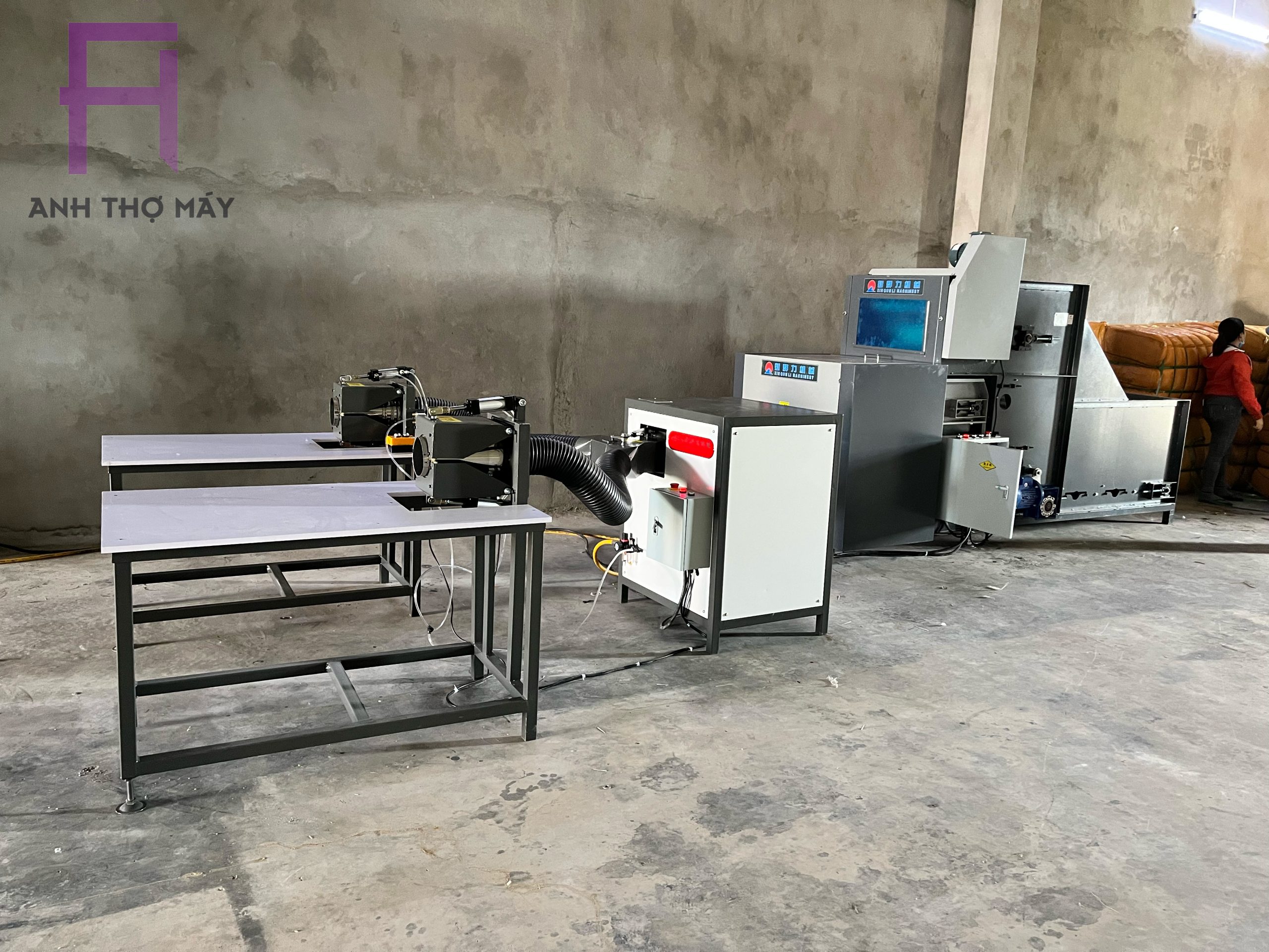 Hệ thống gồm 3 máy kết hợp lại thành một dây chuyền gồm: Máy rải gòn xơ, Máy đánh gòn xơ, Máy thổi gòn 2 đầu.